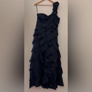 Rickie Freeman Teri Jon Navy Ruffle Tiered Formal Ball Gown w/ Rosette Bow Strap - 12