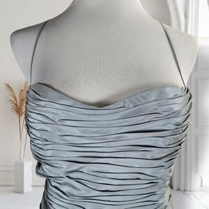 Ruched Shantung silk, full length formal dress with spaghetti straps, sweetheart neckline, column silhouette, front boning in waist and back bodice boning, fully lined with back zipper. I do not believe it can be worn without the straps but please consult your local seamstress.