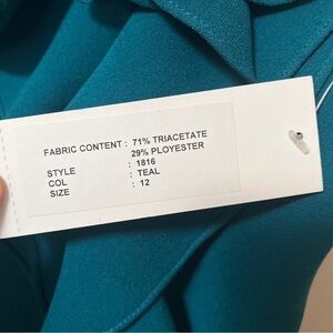 Rickie Freeman Teri Jon Ruffle Mini Dress. Asymmetrical neckline. Women’s size 12, new with tags. One of the hanging strings to hang it up is broken but no other flaws. Gorgeous teal color.