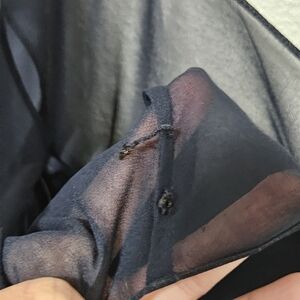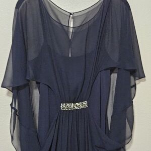 Rickie Freeman Teri Jon maxi length dress with beautiful details size 10 per tags however see measurements below used no holes or stains however the strap connector from the outside layer to inside is broken as shown in pics see all pics for condition measurements approximately flat lay pit to pit 18 waist 16 1/2 length 62 last photo stock photo color of this dress is navy blue