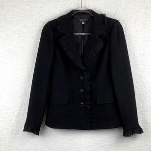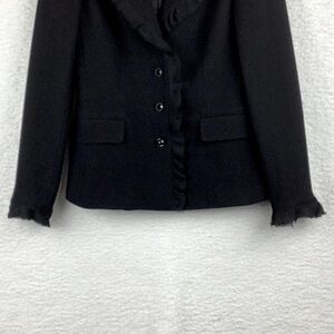 Teri Jon womens size 4 blazer. Lace frills around the collar and sleeves, faux pockets, lined w/4 buttons. 100% wool. Excellent condition. Perfect for a night out or the office.