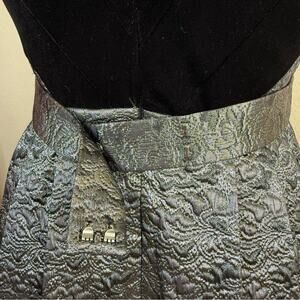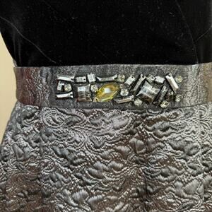 • Skirt: Made of a textured brocade or jacquard fabric with a floral pattern in dark gray or metallic silver tones, giving it visual depth and elegance.