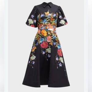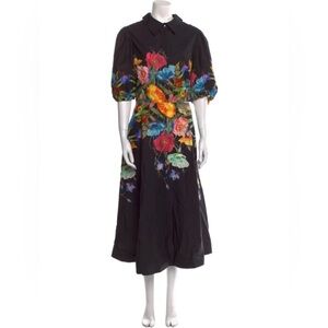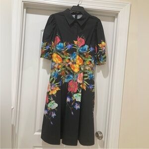 Chic black midi dress with colorful floral design. Features puff sleeves and a fitted waist. Ideal for stylish events.Exellent condition