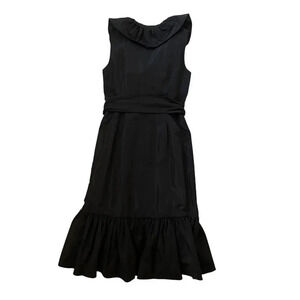 This gorgeous dress is made of a taffeta material, and boasts a beautiful vintage style. This is a wrap dress has an interior button, and exterior buttons that cascade down the front of the dress. Ruffled v-neck, with ruffles down the front and at the hem. Midi length. Bow can be tied in the front or back.