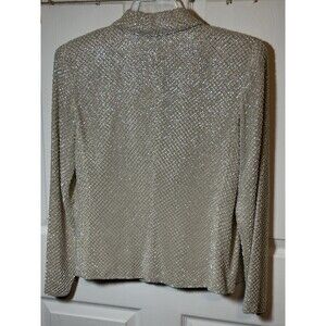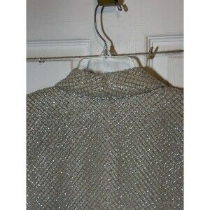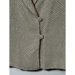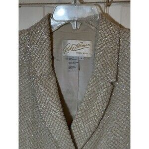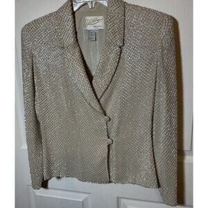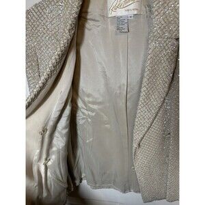 Stunning. This jacket is simply Stunning. 100% silk with a pattern of criss cross iridescent seed beads all over. The lining is acetate. No pockets. Classic notched collar and double button closure. You will absolutely look like a million bucks in this one. Perfect for the Holidays, New Years or Mother of the bride. Photos took a little darker than what it appears in person. It is a lovely beige and a great neutral to go with most any color. Jacket is a weighty 2 lbs 14 oz
