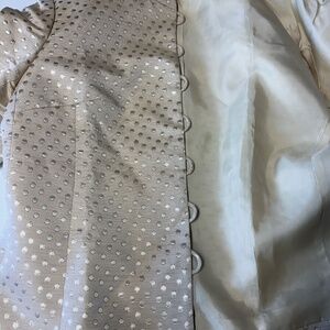 Vintage women’s jacket with gold stitching details, very nice detail on the buttons. In great condition only one minor flaw on the back there is some kind of pen marks very small and fading off could barely see unless you look up close for it.