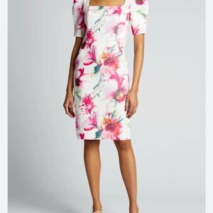 This stunning sheath dress by Rickie Freeman for Teri Jon showcases a vibrant floral design in pink and orange, ideal for a wedding guest or cocktail event. Featuring a sophisticated square neckline and charming puff short sleeves, it offers a stylish and feminine silhouette. Its midi length and tailored fit ensure a chic and polished appearance.