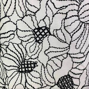 Sold at Bergdorf and Saks Fifth Avenue, this designer is known for innovative and sophisticated designs. This dress is no exception. The front of this sleeveless sheath dress is made of faux white leather embroidered in a black floral design, with a lining for comfort. The back and sides are a slimming black, with a hidden back zipper. The front and back of the dress feature exposed darts with further enhance the lines of this dress. Sophisticated and a little funky. Fabric content and care label is missing, but I would assume dry clean only. Excellent almost new condition. Please see photos for additional details.