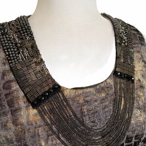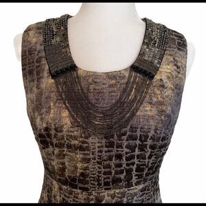 Figure flattering metallic snakeskin-like patterned cocktail dress with a gorgeous beaded collar