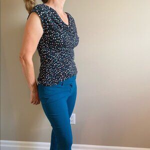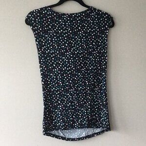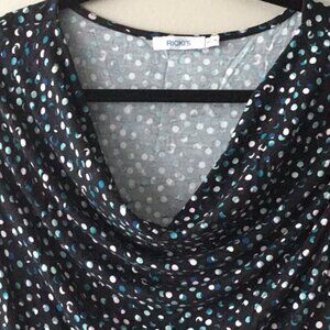 Super cute cowl neckline tee. Background is black with dark and light teal, white and light pink dots.