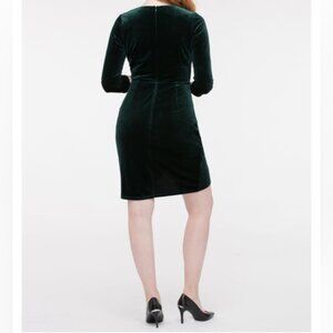 Make an entrance in this show-stopping deep green velvet wrap dress with luxurious long sleeves and a subtle high-low hem. Complete your look with a sparkly rhinestone necklace, earrings and chic evening clutch.