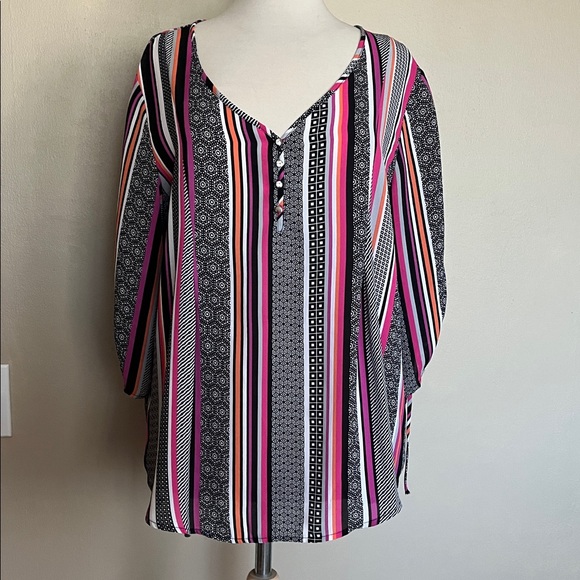 Chic top with bold patterns. Features black, white, pink, and orange hues.