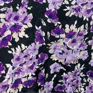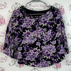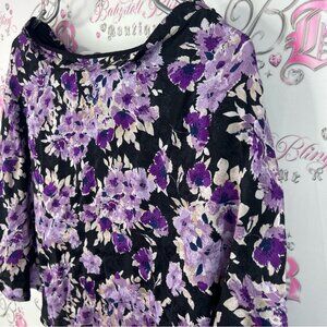 Chic blouse with a striking floral pattern. Features a blend of black and purple hues. Ideal for stylish outings. Size 6.