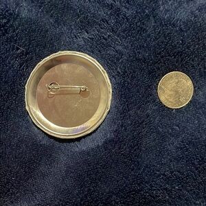 Round button pin with a rickroll QR code. Quarter for size comparison.