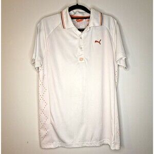 The Puma Polo Shirt is a stylish and comfortable option for casual occasions, featuring a classic collared design with a button closure. Made from a blend of polyester and spandex, this shirt offers a cool and comfortable fit with its COOL CELL technology. The cream white color with orange accents and Puma logo add a pop of color to the regular fit shirt, perfect for wearing in the summer, fall, or spring seasons. Easy to care for with machine washable instructions, this shirt is a versatile choice for any man's wardrobe.