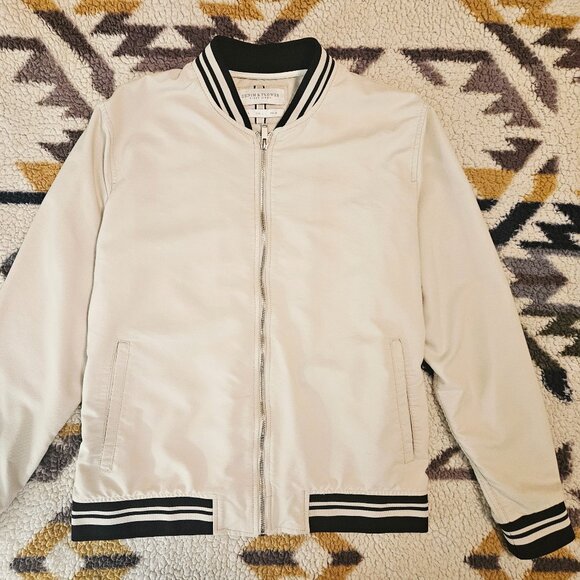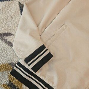Keep warm while looking cool in this oxford bomber iacket that is stvled with a striped blade elastic collar, cuffs and hem. Front zip closure. Blade collar. Long sleeves with ribbed cuffs. Front welt pockets. 65% polyester, 35% cotton.