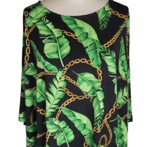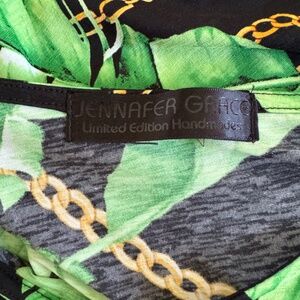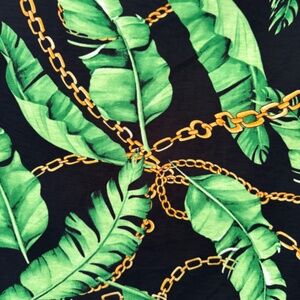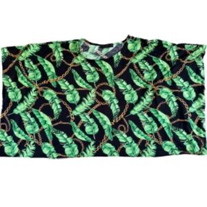 One of a kind scarf top by California designer Jennafer Grace. Palm leaf and gold chain print in a bouncy/stretchy and cool bamboo jersey. Machine wash cold and line dry. One size fits all up to approximately US size 22. In excellent condition and worn only a handful of times. From a non-smoking and no pet house.