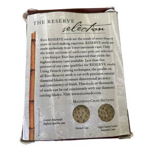 Enhance your musical performance with Rico Reserve Clarinet Reeds. Crafted from lower-internode cane for superior density and precision, these reeds provide consistent sound quality. The built-in Reed Vitalizer maintains optimal humidity, reducing warping and cracking risks, ensuring longevity. Suitable for professional and dedicated musicians seeking unparalleled clarity and resonance in every note. **Box is battered but reeds are sealed, new.