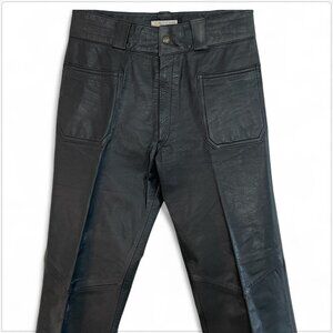 Amazing vintage leather pants with zip and snap front close. 2 large front patch pockets. Legs have a great retro inspired flare. High waisted style.