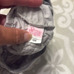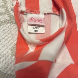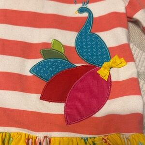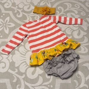 Adorable peach striped top with colorful peacock design. Features a yellow ruffle hem. Includes matching gray bloomers and yellow headband. An adorable set.