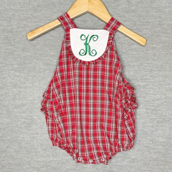 Ricrac & Ruffles Bubble Romper Monogrammed “K” Christmas 6/9 M Girls Red Green
