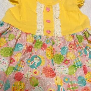 Adorable yellow tunic top with an adorable Easter egg and bunny print! Sweet heart buttons and lace trim detail on the pants and lace detail around buttons. The pants are more capri length. Worn once or twice for pictures and Easter morning.