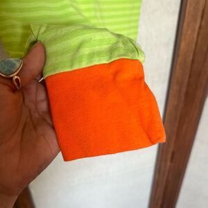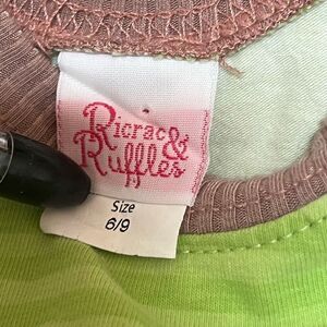 Gently used Ricrac & Ruffles Green Striped Pumpkin Onesie.