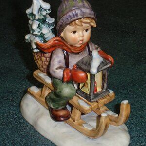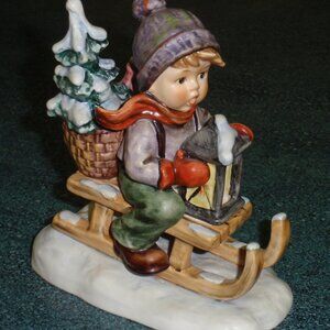 The next Hummel from our collection is this LARGE "Ride Into Christmas" Goebel Figurine #396/I TMK6. This figurine is the LARGE VERSION standing an impressive 5-3/4" tall x 5" wide. It features a young child all bundled up on a sled with a lantern and a snow-covered Christmas Tree on the back. Super cute! As you can see in the pictures it is in MINT condition with no chips, cracks, crazing or repairs and comes complete with the original box!! Still displays beautifully with nice and vibrant colors!! Amazing condition for a piece of this age! Identified on the bottom as Hummel #396 it has the TMK6 trademark dated 1986!