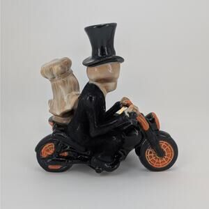 Hit the open road to eternal love with this retired and highly collectible Yankee Candle Boney Bunch "Newly-Dead Riders" candle holder. This captivating piece features a dapper skeleton groom on a motorcycle, with his ghostly bride seated in the sidecar, ready for their forever ride. A perfect blend of spooky and sweet, this holder is an absolute must-have for Boney Bunch enthusiasts and motorcycle lovers. Don't miss the chance to own this rare and charming addition to your Halloween or year-round decor.