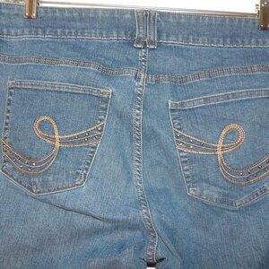 light to medium blue wash , embroidered and lightly Embellished back pockets , 5 pocket style with belt loops , boot cut , material is 73% Cotton 25% Polyester 2% Spandex , Sz 16 Petite Rise measures 10" Inseam measures 27.5" Waist lying flat measures 18" , good used condition no holes or stains shows minor to moderate washing wear , pet friendly non smoking home