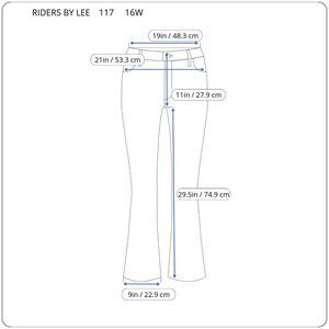 The Riders By Lee Women's Jeans in size 16W Plus offer a boot cut style in a muted black denim fabric. Featuring a zip fly closure, these plus-size jeans are made from a cotton blend material with a regular fit. The 5-pocket design, including a classic straight style and stretch features, makes them a versatile and comfortable choice for any season. Machine washable and with a 29.5-inch inseam, these jeans from the trusted brand Lee are a timeless wardrobe staple for any woman looking for both style and comfort.