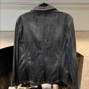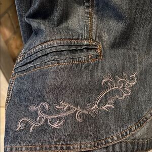 Stylish dark blue jean jacket. Embroidered details on pockets. Classic button closure. Perfect for casual wear. Like new condition.