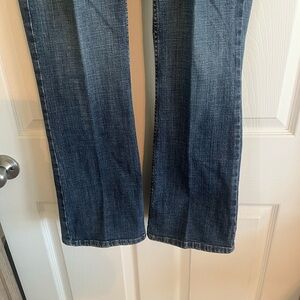 Stylish dark blue stretchy boot cut jeans. Comfortable fit with a modern look. Waist measurement is 30”. These are probably a size 10, but the inside tag is too worn to read. These jeans are mid rise and are in very good condition. No signs of wear on hems.