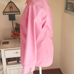 Pretty in pink. Easy care. Princess seams. Size M measures 42 at chest, 34 at waist, 42 at slightly curved hem. 26.5 long from shoulder to hem. 21.5 sleeves. Easy breezy and a great Coastal Cowgirl look.