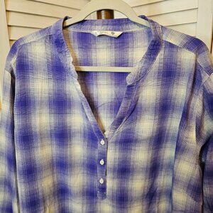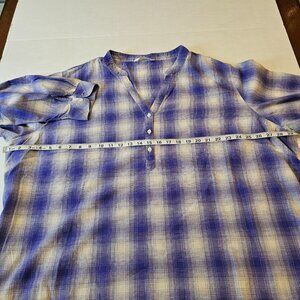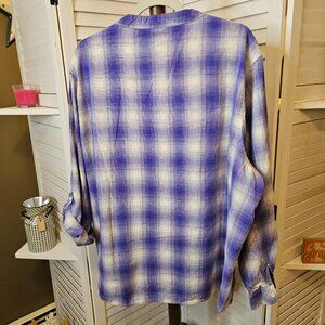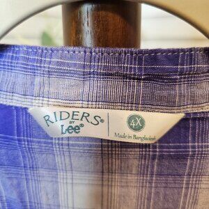 Riders by Lee, Plus Size 4X, Purple Plaid, V-neck, Pull Over Shirt, Long Sleeved/roll up and button cuff, back slightly longer than front. 100% Cotton, machine wash and dry. Gently worn. See Pics for Measurements.