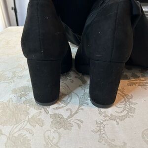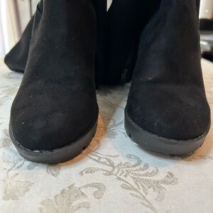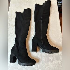 Ridge-28 black thigh high, high heel boots, 3.5' block heels has inside zipper, size 7.5.