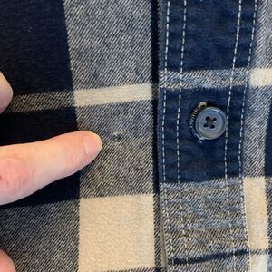 Ridgecut Toughwear Flannel Shirt Button up Mens 2XL Blue Tan Plaid Heavy 100% Cotton. 2 front pockets, 2 button adj sleeve cuff. Does have small hole in front by button-see picture. good clean condition. Verified measurements -