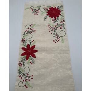 Bring timeless holiday charm to your table with this Ridgefield Home embroidered runner. Featuring raised, felt-like poinsettia appliqués against a durable polyester-cotton blend, it’s the perfect mix of elegance and festive detail. The 14" x 72" size makes it ideal for dining tables, buffets, or consoles, while the classic red floral motif brightens any Christmas setting. A versatile piece to enjoy year after year or gift to someone who loves holiday décor.