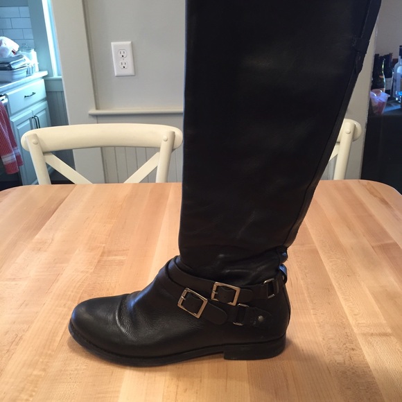 Great wear-with-everything black leather riding boots from Matisse. Double buckles across ankles. Approx. 1" boot heel height. Approx. 15" boot shaft circumference. Approx. 16" boot shaft height. Cushioned footbed. Premium leather upper. Zipper entry for easy on and off. NOTE: Some normal wear in heel and ankles. Shown in photo three.
