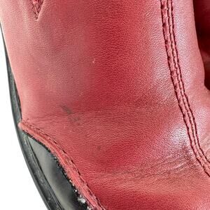 Good condition, do have a few spots on left shoes & left back flap has fear (pictured). Red & black low heeled square toe slip on low heeled loafers. Approx. measurements: Length 11", heel 1 1/4". Size 10