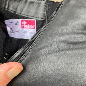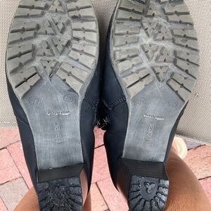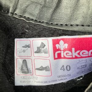 Rieker Black Leather Ankle Boot, size 40. Lug sole and chunky heel for traction and stability. These may be waterproof leather, as I recall. I normally wear size 8.5 and these fit comfortably with an inset and heavy sock. Dressier yet comfortable option for ice and snow. Stacked wood heel. Stretch goring for comfort.