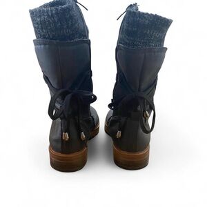 Rieker tall black boots with a grey knit cuff and fleece lining and laces on the back which are just for looks. Side zip makes them easy to slip on and off. Has cute little stud details and pewter bead tips. Warm, comfy, and great for cold weather. Winter and fall vibes.