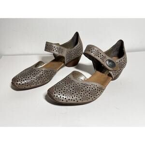 You are bidding on a pair of Mirjam shoes from Rieker, taupe leather, size 37 EU, 6.5 US, excellent used condition. Adjustable hook/loop strap, cutout design, 1.75" cork heel.
