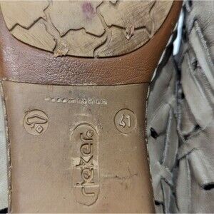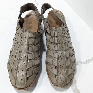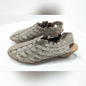 Rieker Gray Cross-Knit Closed-Toe wowen Sandal mule boot wedge 1.77'' heel size 41 US 9.5. Comfortable and great for walking. Woven and wonderfully unique, this slingback-style slip-on from Rieker makes a chic addition to your casual wardrobe. The Sina is crafted with a rich leather upper, accented with a scalloped collar and made comfy and snug with an elasticized heel strap. Try teaming with a pair of walking shorts and tailored jacket for a trendy, girl-about-town look.