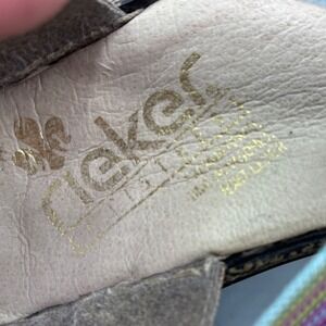 Stylish and comfortable, these Rieker slingback sandals are a distinctive choice for everyday wear. These beige leather shoes feature a unique design with a decorative silver ring embellishment and a colorful elastic band across the foot. The slingback style ensures a secure fit, while the textured sole provides traction and durability. A versatile addition to any wardrobe, they offer both fashion and function with their comfortable construction and eye-catching details.