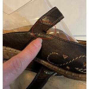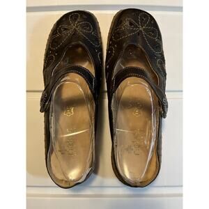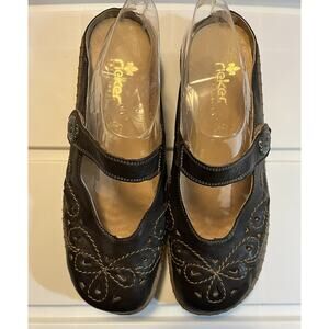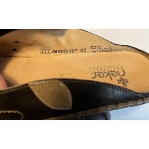 Rieker Women's Brown Leather Slip-On Mules Embroidered Decorative Button Size 41. US size 10.5 In good pre-owned condition, minor signs of wear. Elastic strap on one shoe is a little stretched but still functional. Please see all pictures for condition.