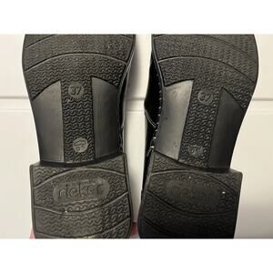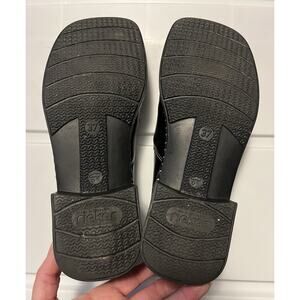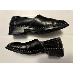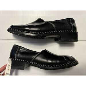 Rieker Women’s Size 6.5 US Leather Comfort Loafer Black Square Toe Slip On. In good pre-owned condition, some creasing on toe area and wear on heels. Please see all pictures for condition and wear.