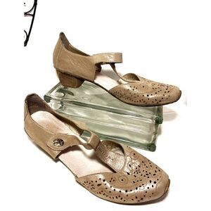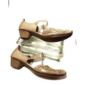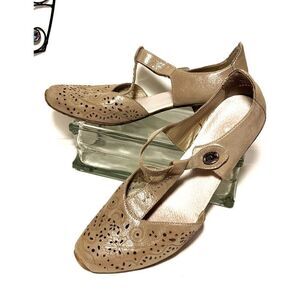 Gray colored laser cut Reiker heels. T-strap with Velcro closure. Faux gemstone accent at closure. Synthetic sole and heels. Runs more like a size 11. Very comfortable. Very lights signs of wear at heel, rest of shoe is awesome!