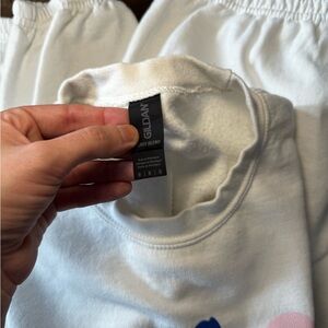 Soft white pajama set by Gildan. Features blue and pink accents. Ideal for lounging.