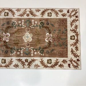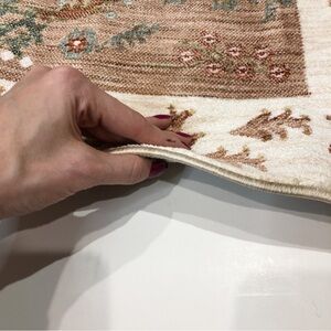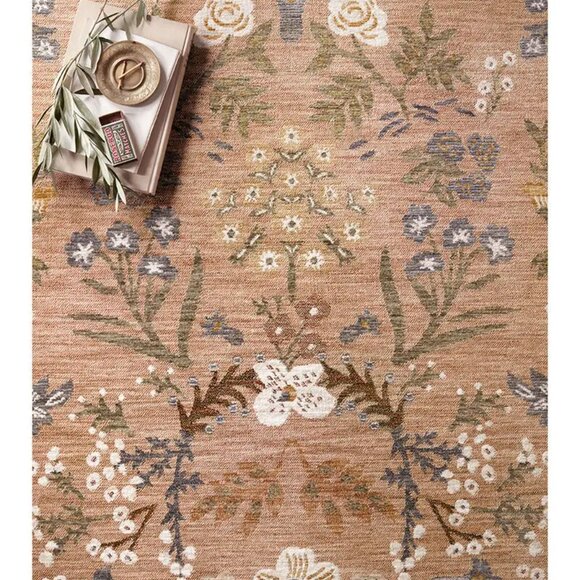 NWT Rifle Paper Co. Kismet Arabesque Power-Loomed Rug in the rust colorway. Our Kismet rug combines our signature hand-painted illustrations with traditional rug designs and comes in subtle shades that pair well with a mi× of color palettes and design schemes. Power-loomed in Turkey with polypropylene and polyester and finished with a subtle fringe trim, this rug has a soft pile that doesn’t shed and is stain resistant, fade resistant, and colorfast. Part of our Rifle Paper Co. × Loloi collaboration. 2' x 3'4", power-loomed, 76% polypropylene + 24% polyester, cotton canvas backing, 0.25" pile height, cream and rusty orange with other warmer green toned floral print throughout. It will need rug tape or lots of heavy books to help flatten the rug out when you receive it as it was rolled pretty tightly and flat at the store, will be rolled when shipped. This would be great in a little girl's room, playroom, bathroom, entryway, closet, hallway, laundry room, office, or any where else you can think of! So pretty!
